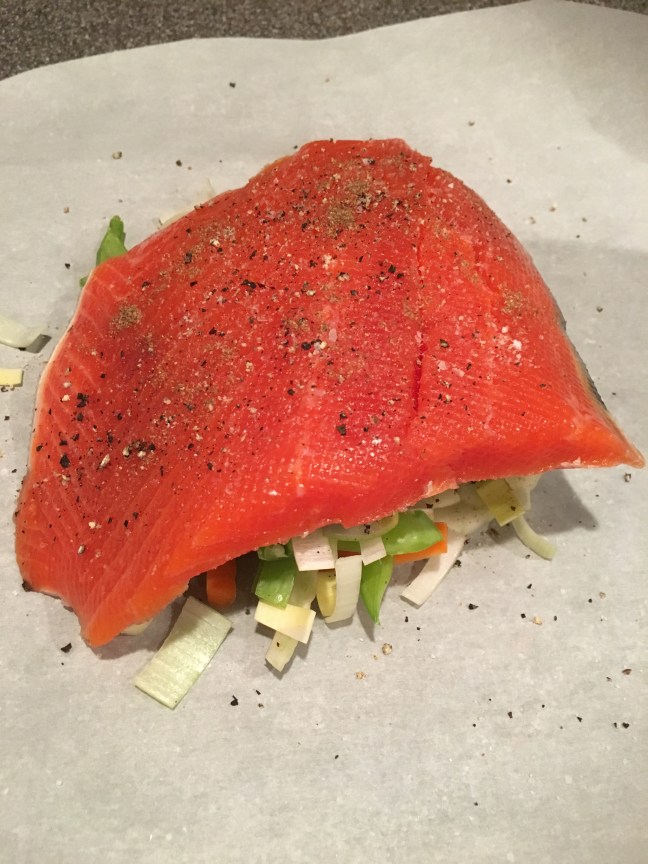 Salmon fillet placed on top of vegetables. Seasoned with salt, pepper, and coriander.