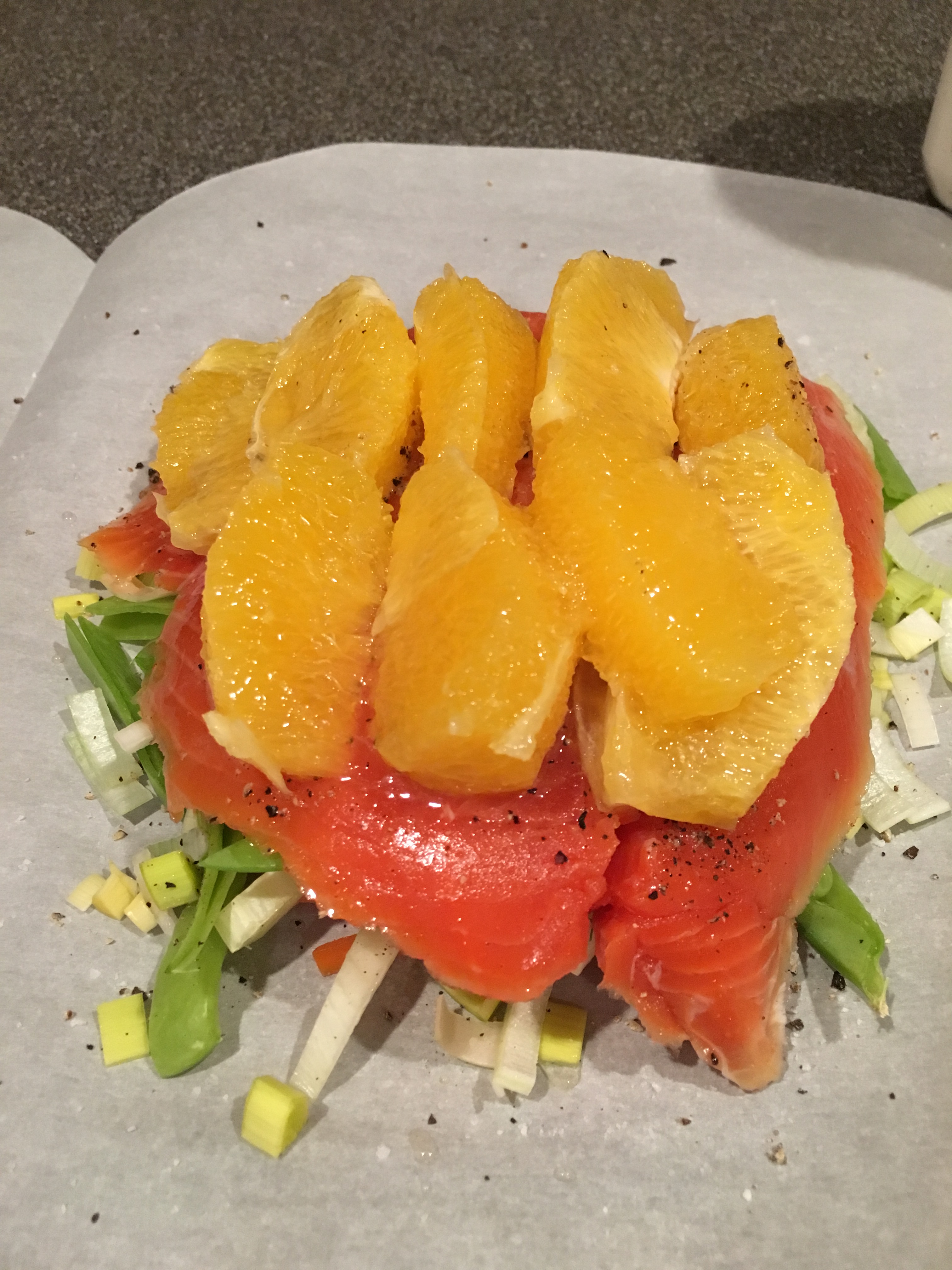 Fish, veggies, and oranges drizzled with vermouth.