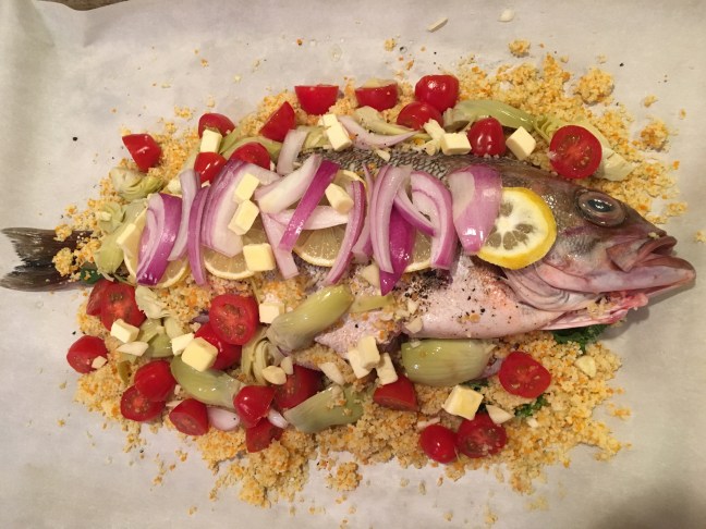 Couscous, artichoke hearts, tomatoes, garlic, lemon, red onion, wine, and butter added to fish.