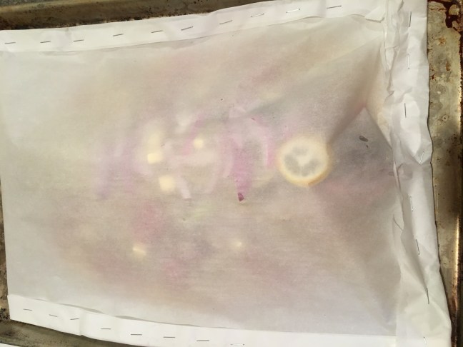 Parchment folded and stapled over fish.