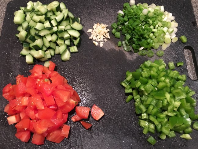Chopped cucumber, garlic, scallions, tomato, and bell pepper.