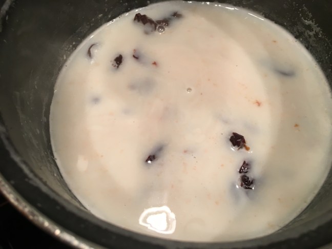 Milk, dried cherries, and sugar after steeping 10 minutes.