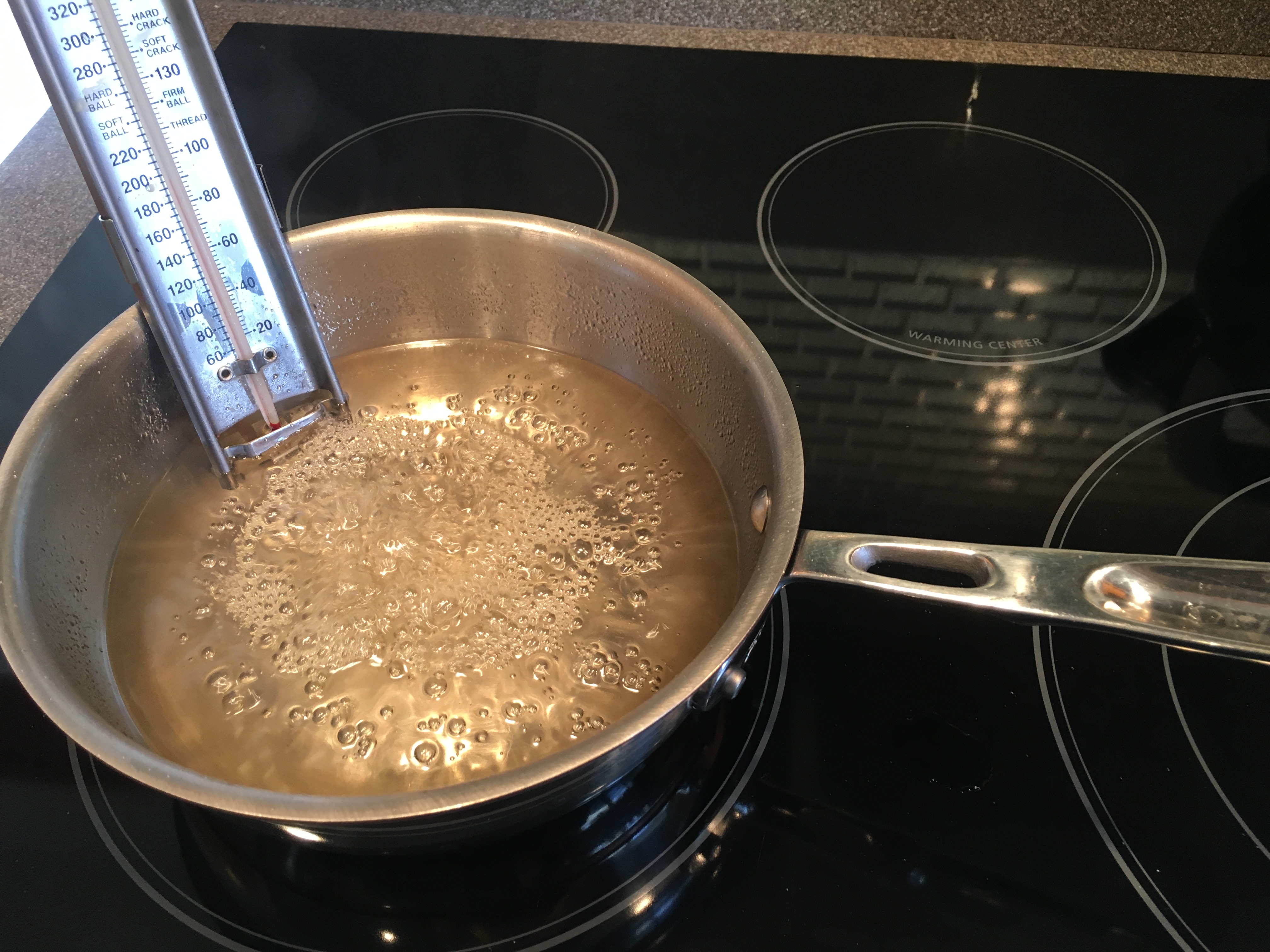 Heat decreased, thermometer in place, and syrup continuing to cook.