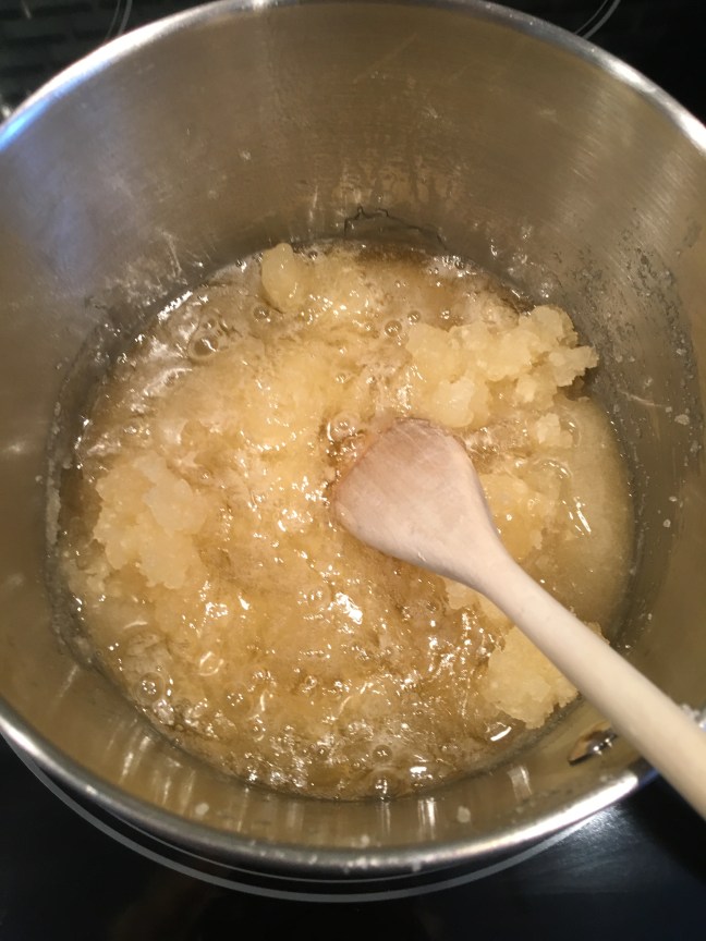 Gelatin mixture placed over low heat to dissolve.