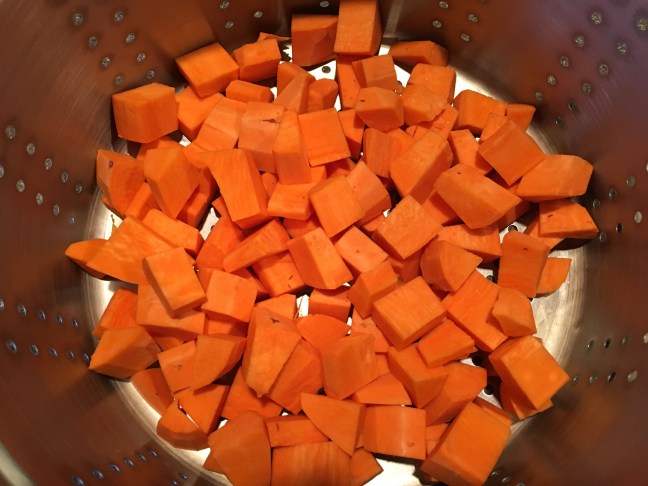 Cubed sweet potatoes in the steamer.