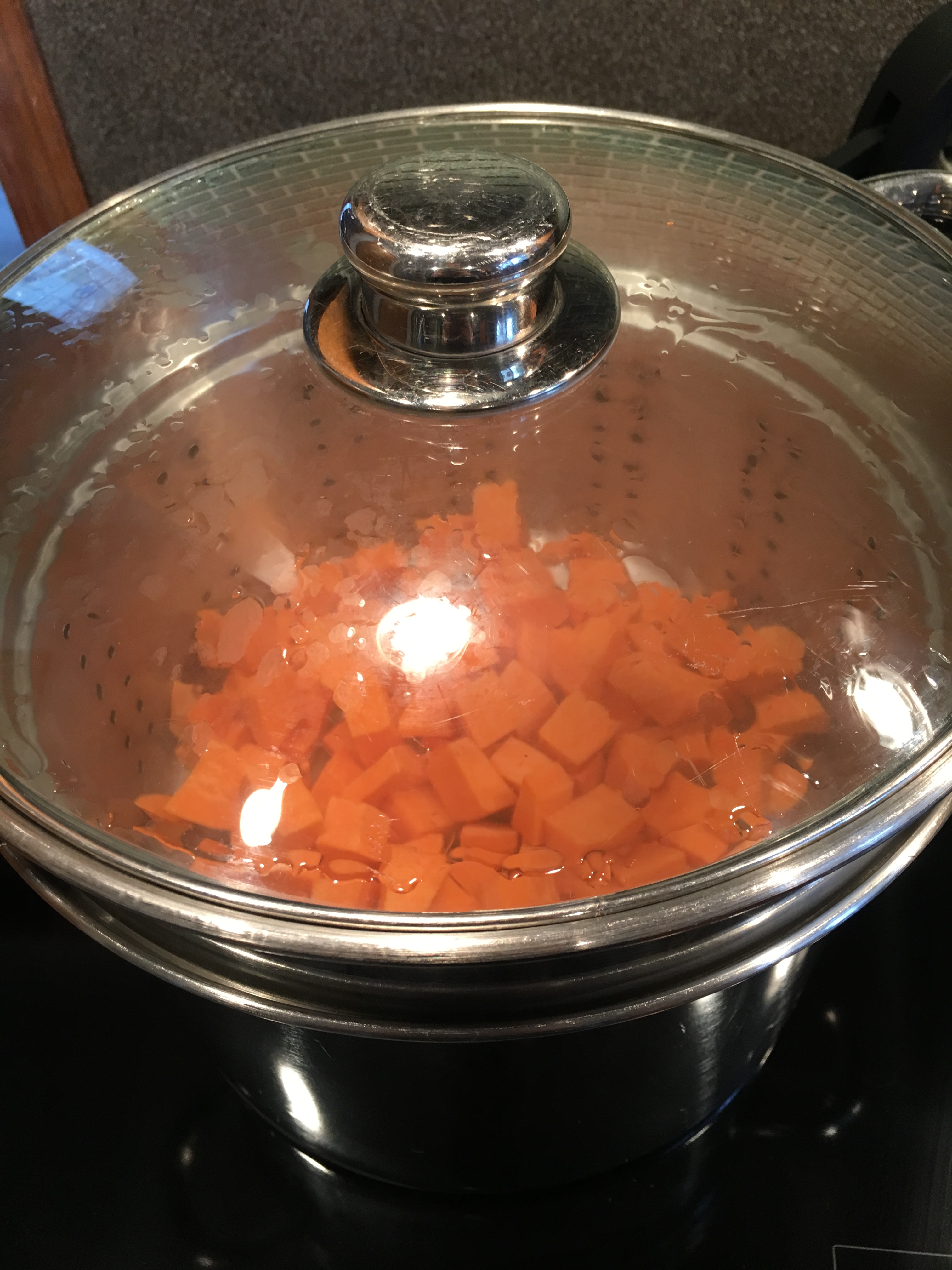 Cubed sweet potatoes in the steamer for 20 minutes.