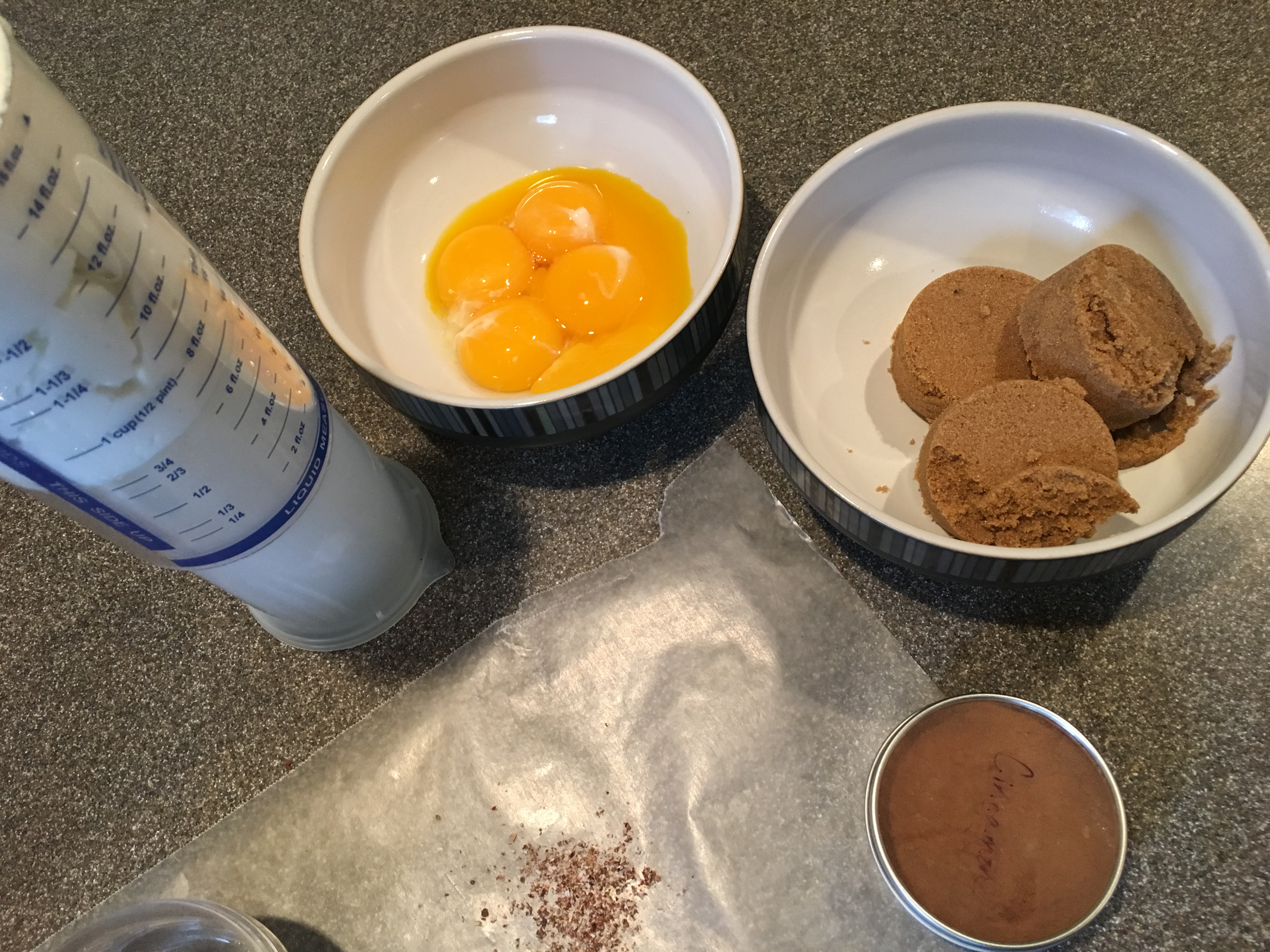 Additional pie ingredients: yogurt, egg yolks, dark brown sugar, cinnamon, and nutmeg.