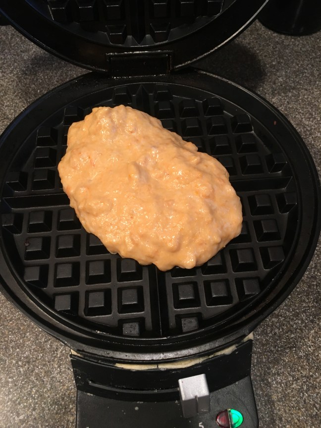 Batter placed on heated waffle iron.