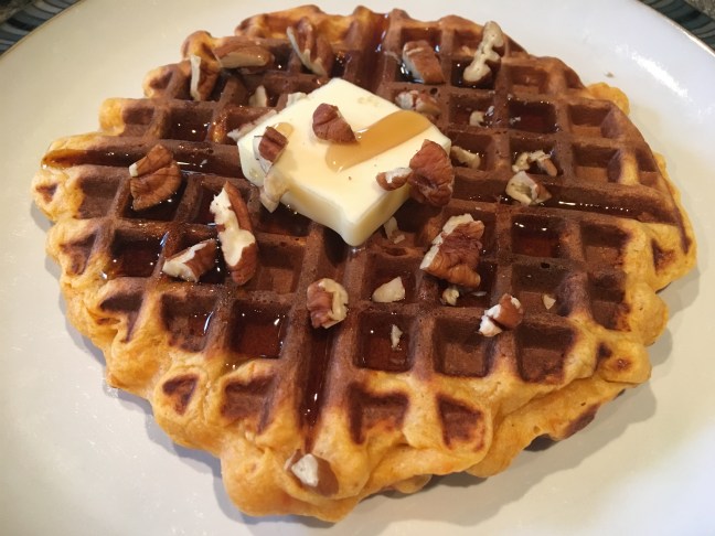 A sweet potato waffle with butter, syrup, and toasted pecans.