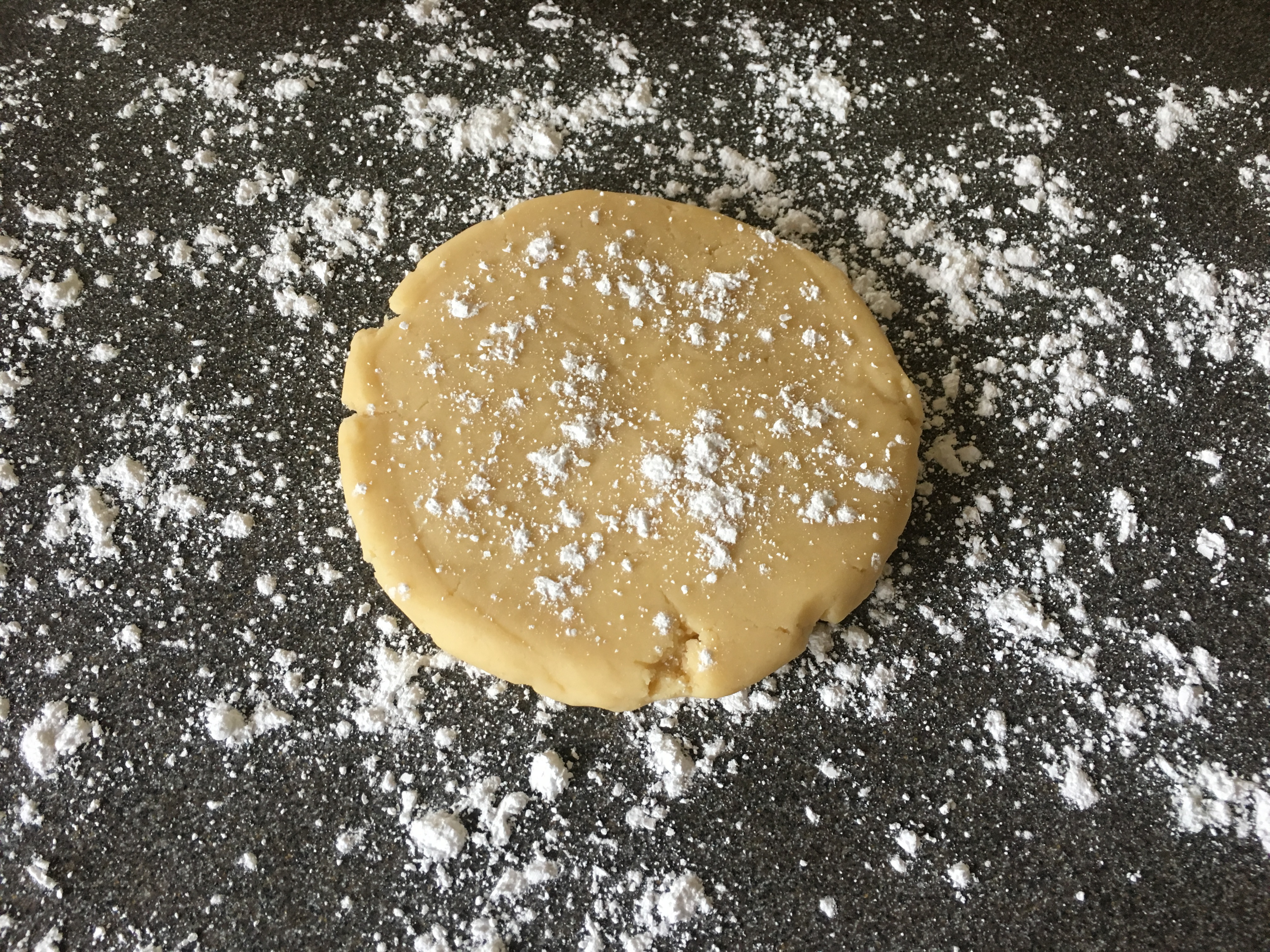 Cookie dough after chilling. Ready to be rolled out with powdered sugar.