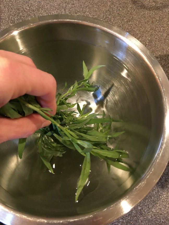 Herbs taking a dip in bleach water.
