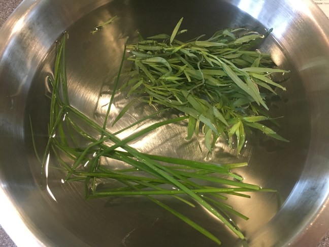 Fresh chives and tarragon in fresh water after dipping in bleach water.