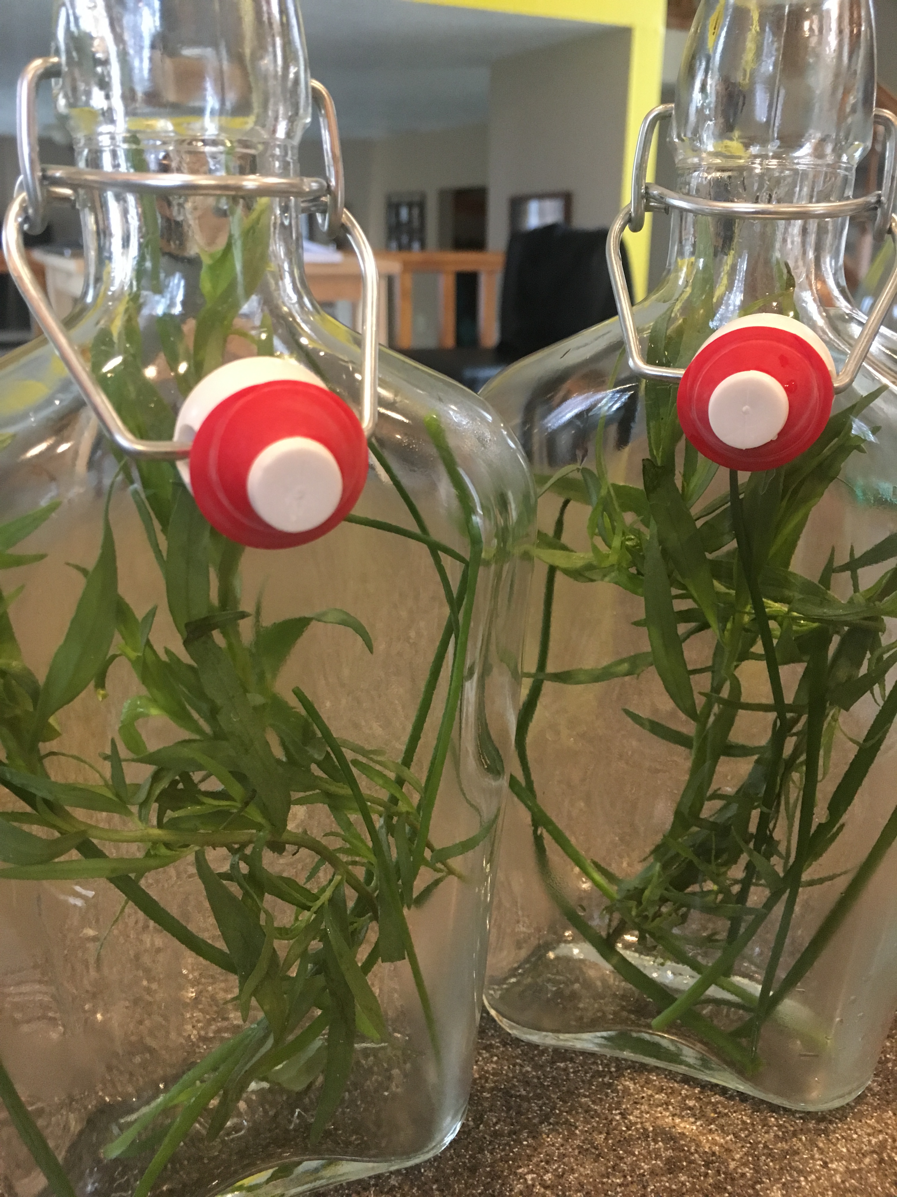 Fresh herbs placed in glass bottles.