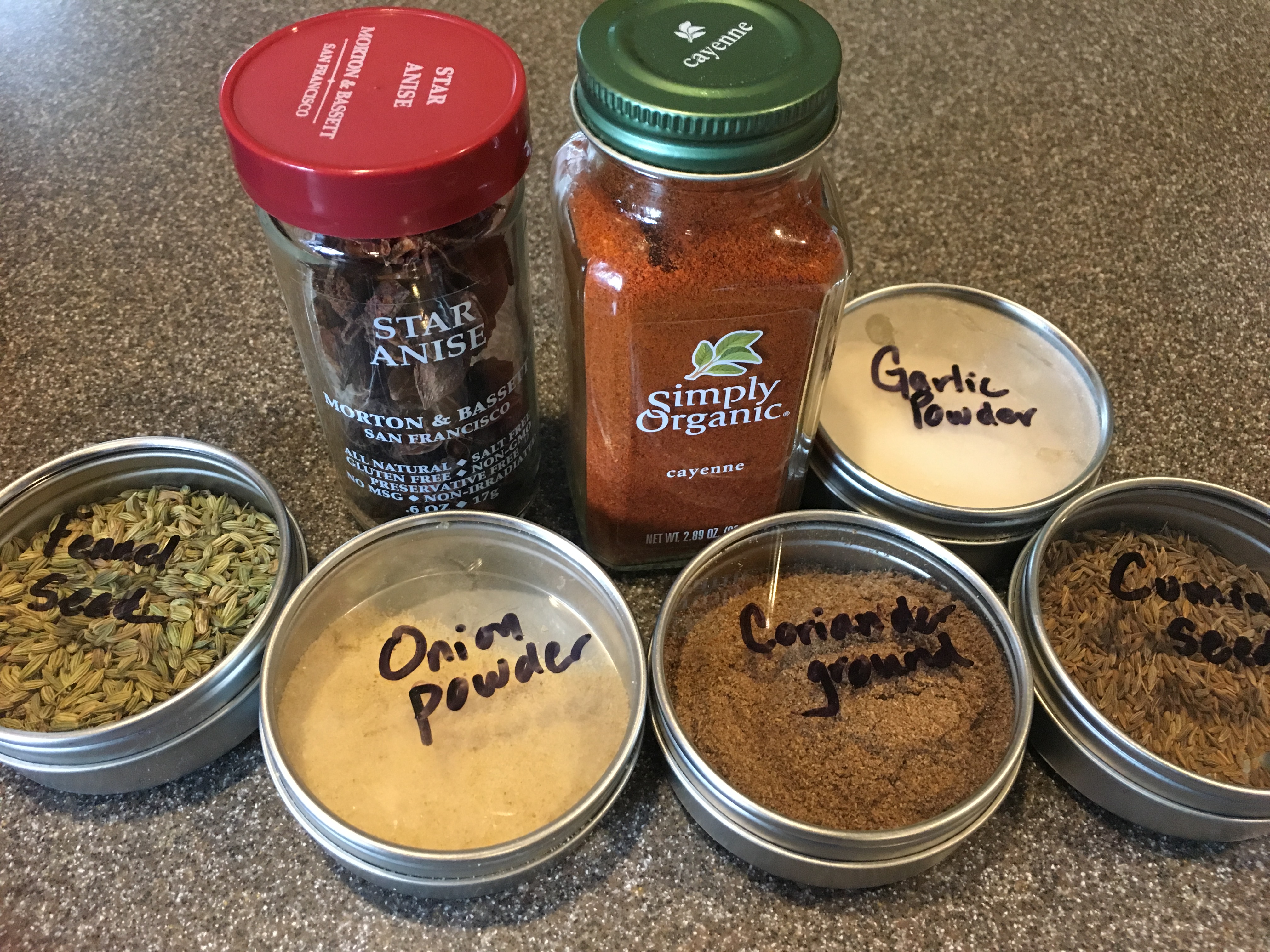 Spices for Alton’s pomade: star anise, cayenne pepper, garlic powder, cumin seed, coriander, onion powder, and fennel seed.