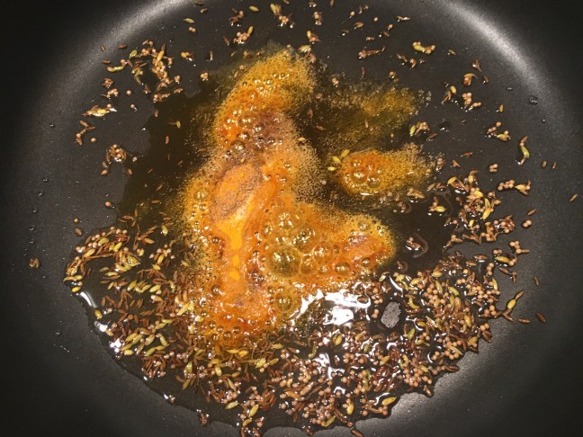 Coriander, onion powder, cinnamon, and turmeric added to skillet once mustard seeds began to pop.