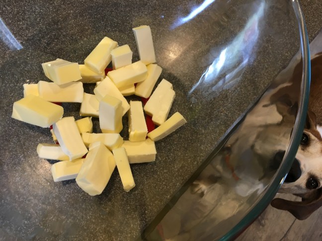 Two sticks of butter, cut into pieces and placed in a large glass bowl.