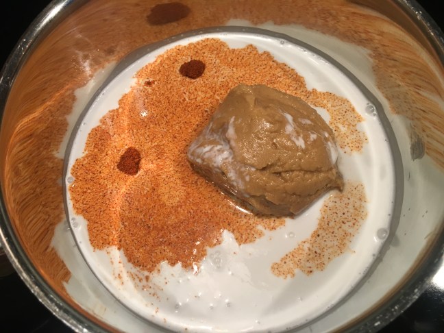 Cashew butter, coconut milk, and cayenne pepper in a saucier over medium heat.