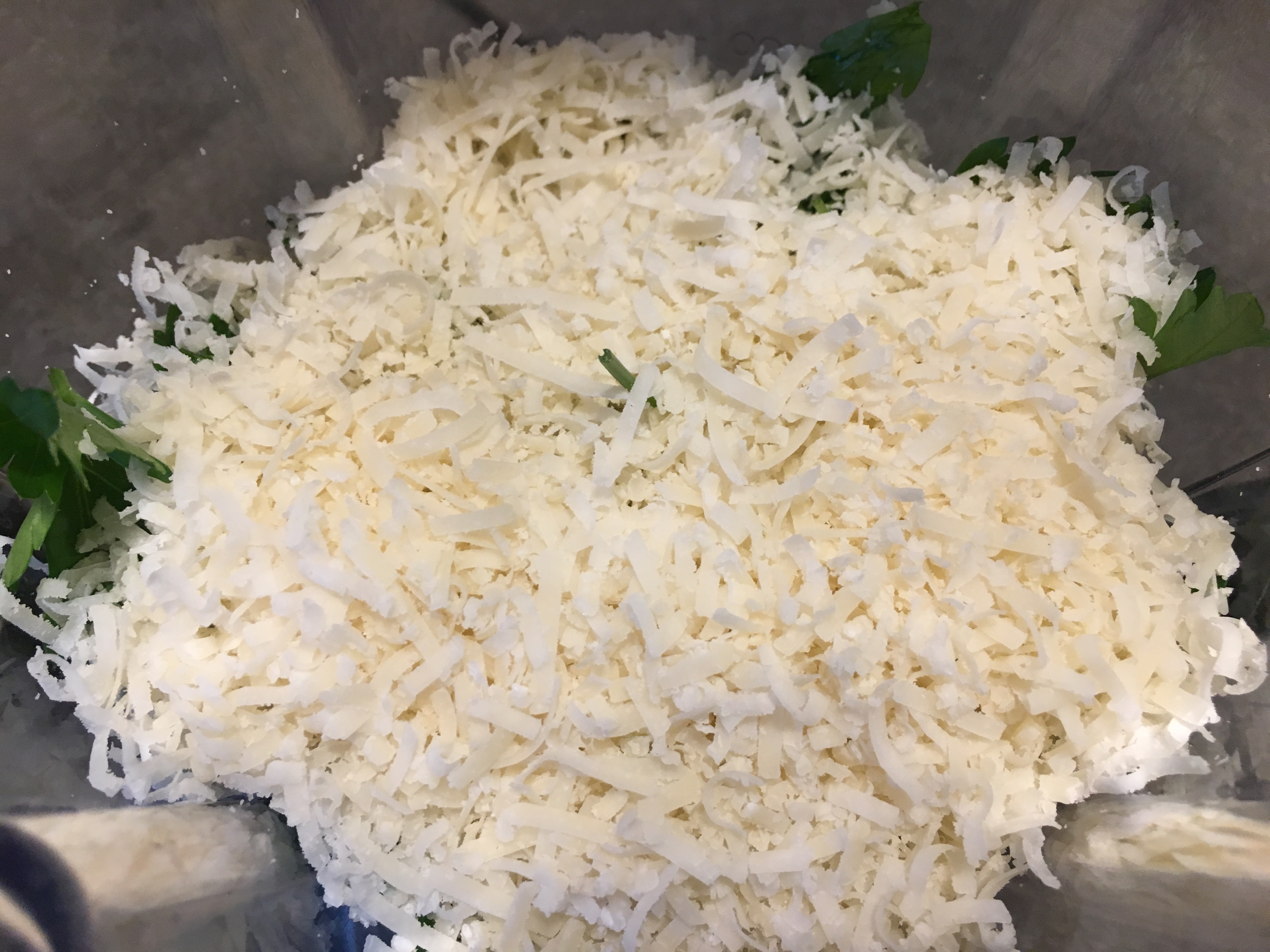 Parsley added to blender, along with Parmesan.