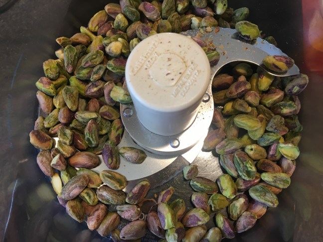 Pistachios in food processor.