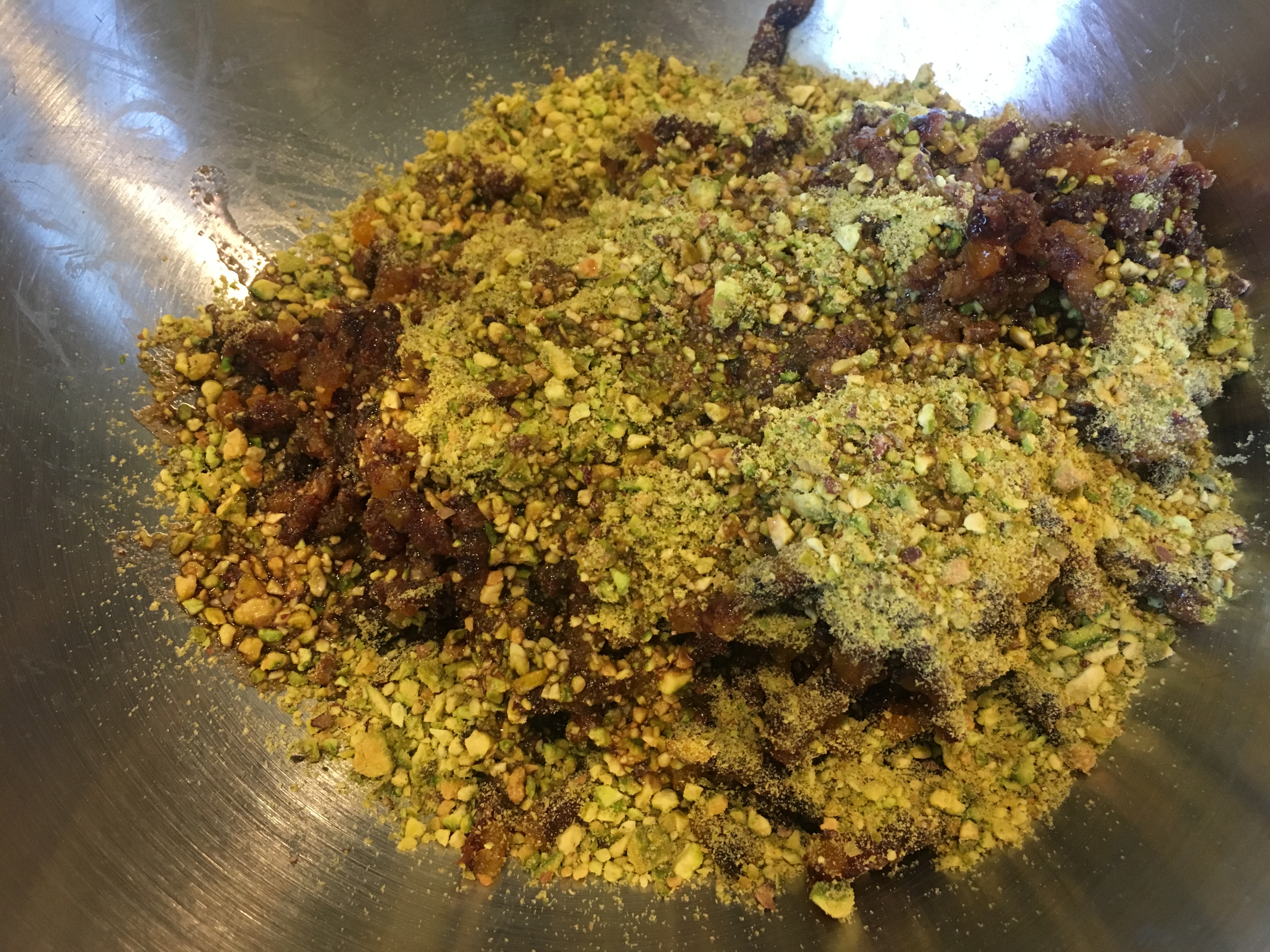 Pistachios added to ground fruit, along with OJ and creme de cassis.
