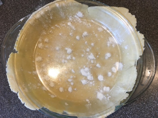 Pie plates flipped over with dough between them. Dough is lining second pie plate.