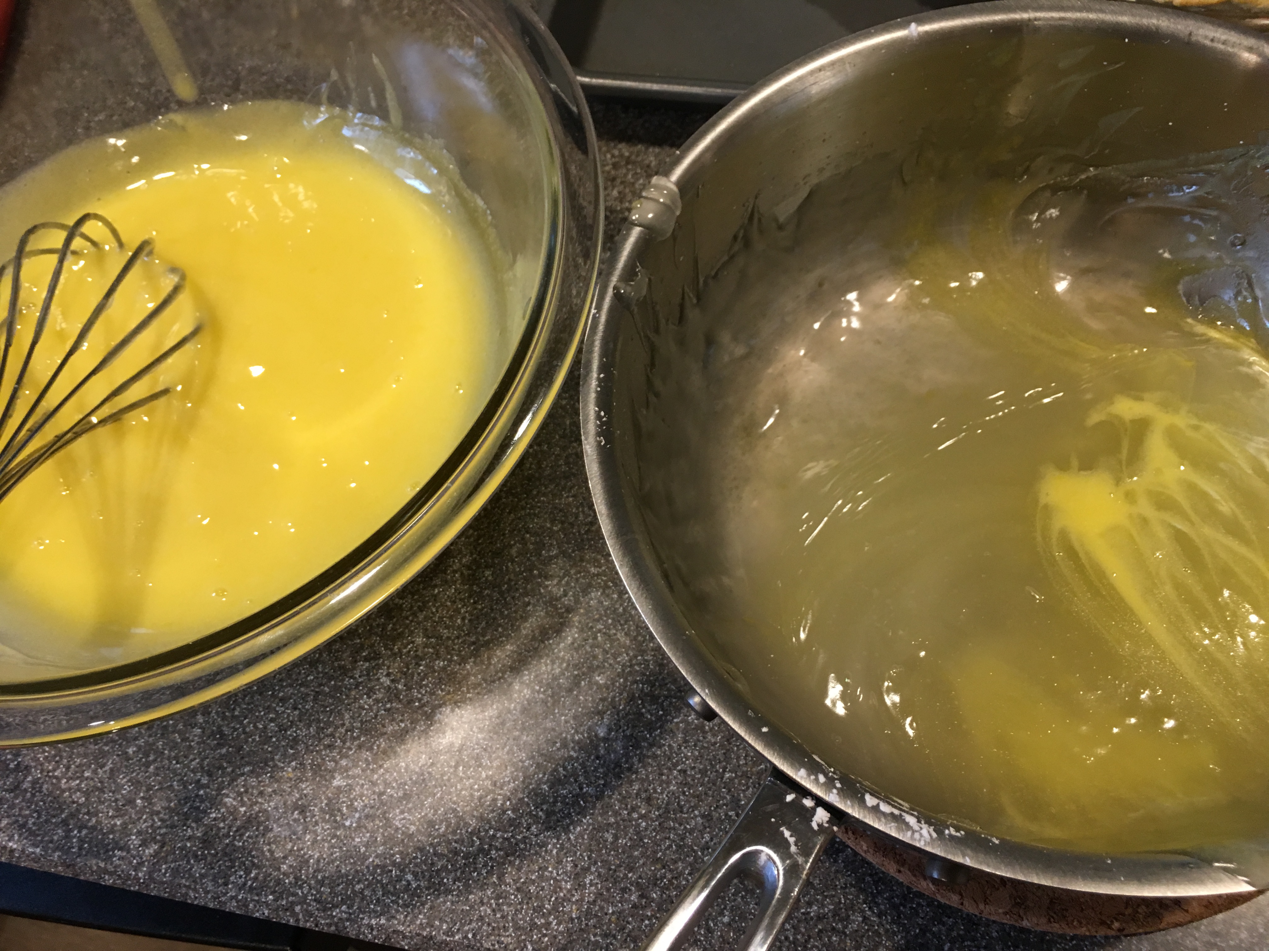 Slowly whisking hot starch into egg yolks, a little at a time.