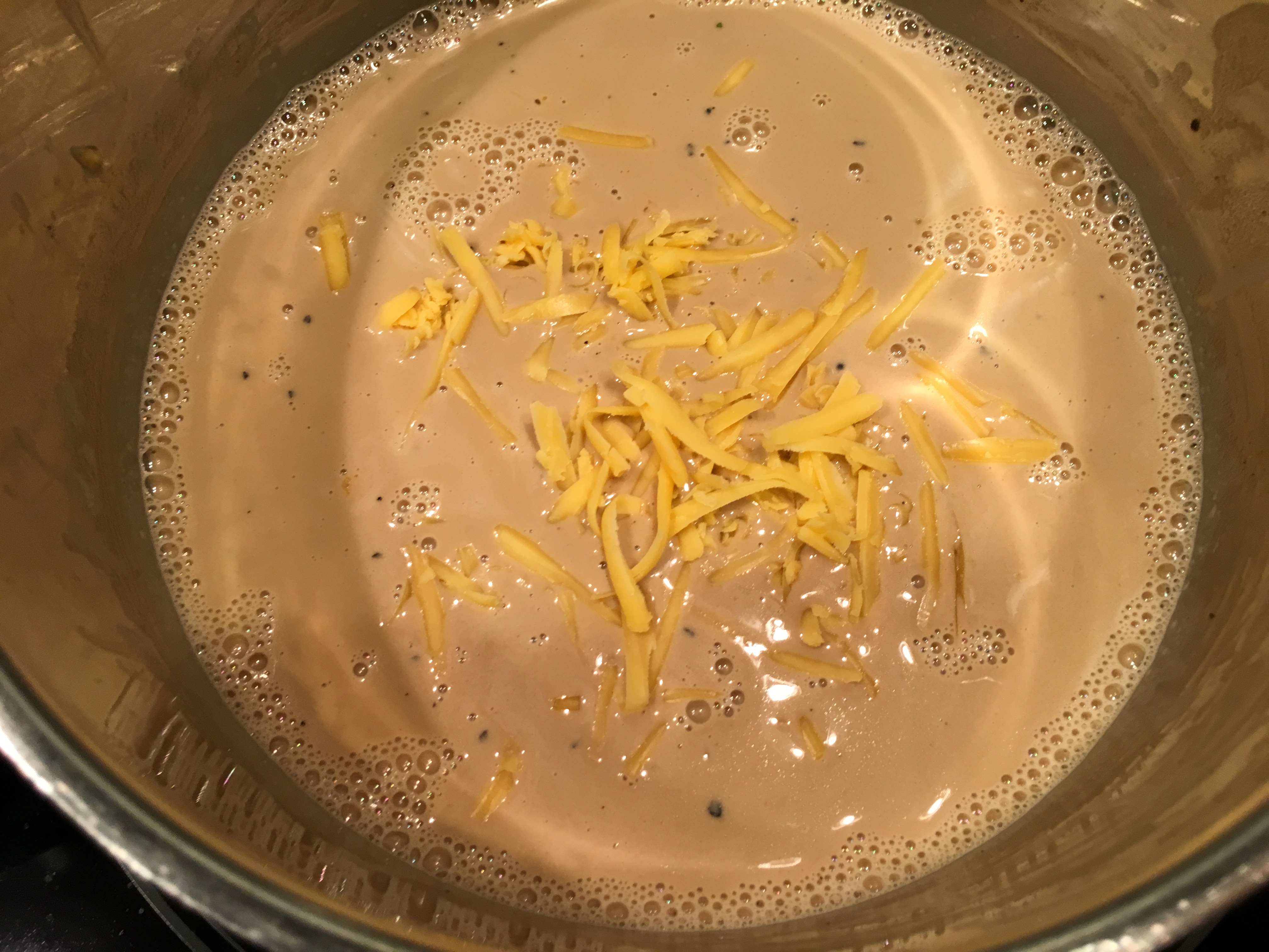 Adding shredded cheese a handful at a time.