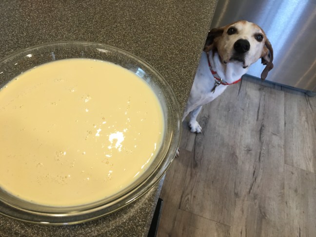 Chilled custard poured into pie plate.