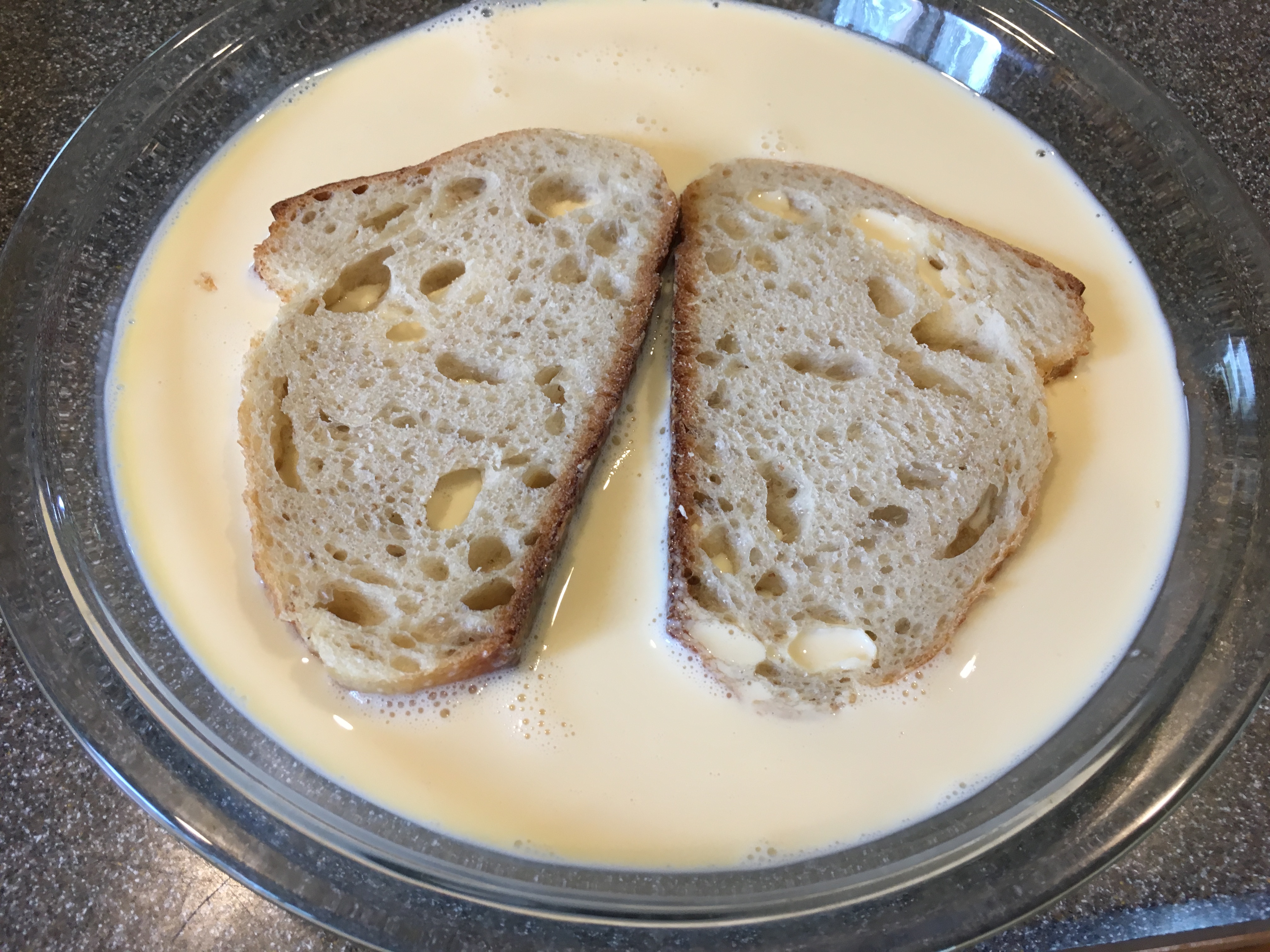 Two slices of air-dried bread soaking in custard for 30 seconds per side.