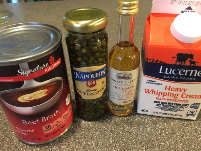 Ingredients for pepper cream sauce: beef broth, green peppercorns, cognac, and cream.