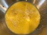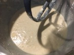 Alton’s doughnut recipe is for yeast doughnuts, which are much lighter than their cake counterparts. Yeast doughnuts are obviously leavened with yeast, while cake doughnuts are leavened with baking powder. While yeast doughnuts are light and airy, cake doughnuts tend to be heavier and more dense, and I happen to think both are fantastic. The first step for Alton’s doughnuts is to put 2 1/2 ounces shortening in a bowl and heat 1 1/2 C milk until the milk is just hot enough to melt the shortening (I heated my milk in the microwave). Once hot, pour the milk over the shortening and set aside.