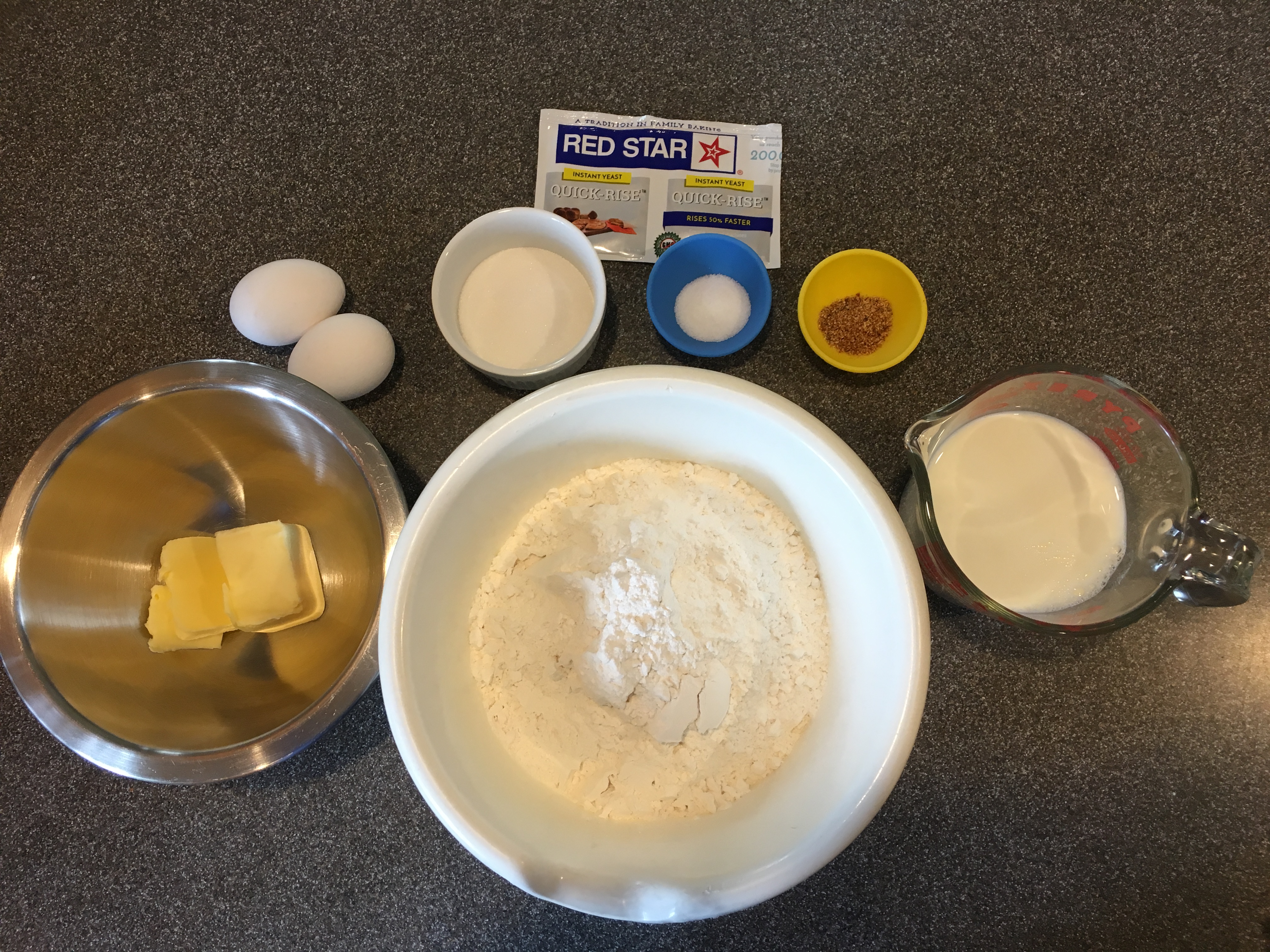 Ingredients for doughnuts: yeast, eggs, sugar, salt, nutmeg, shortening, flour, and milk.