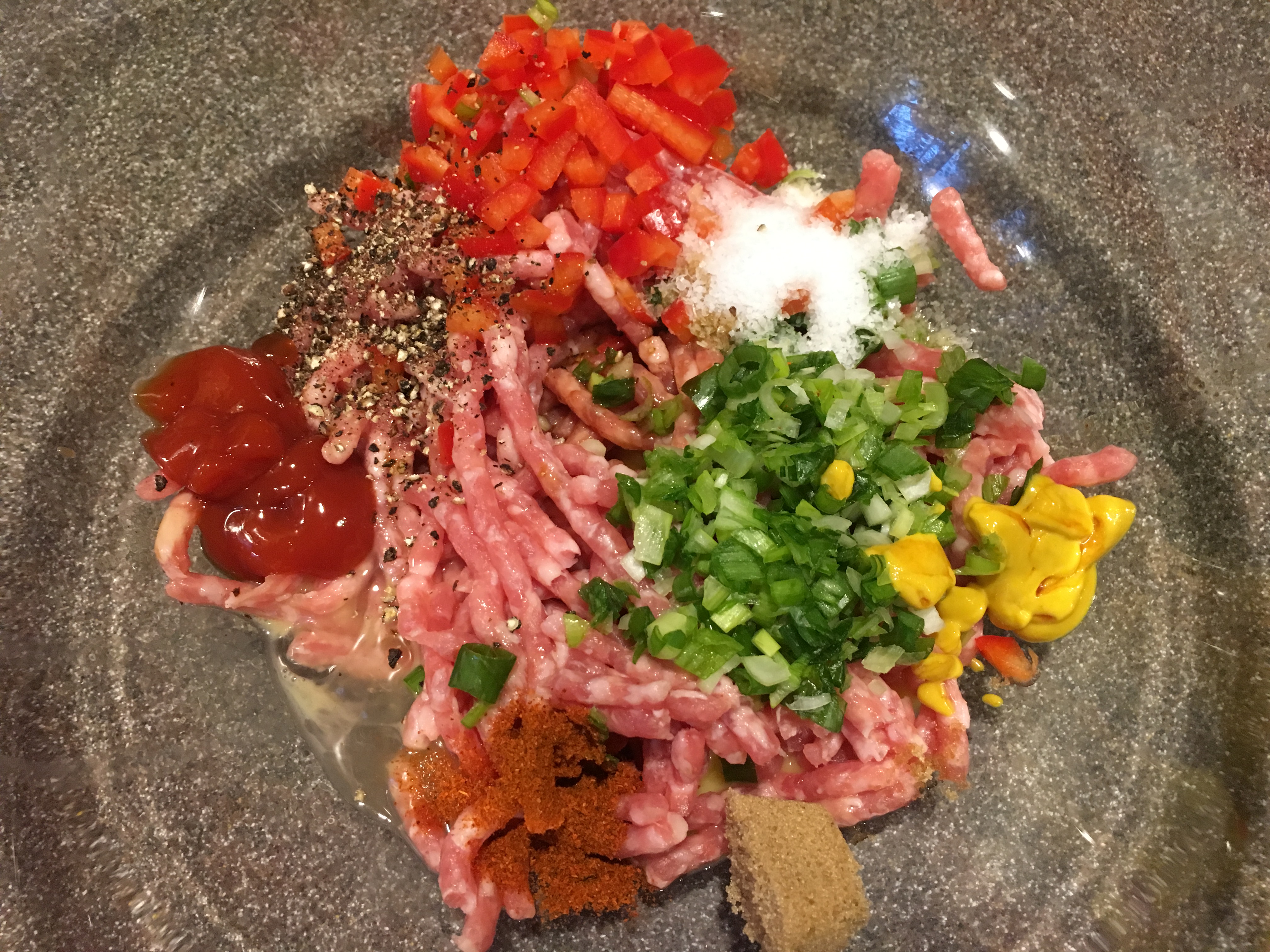 Ground pork, an egg, red bell pepper, scallions, Kosher salt, pepper, brown sugar, cayenne, Worcestershire, ketchup, and mustard.