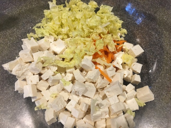 Cubed tofu, grated carrot, and Napa cabbage.