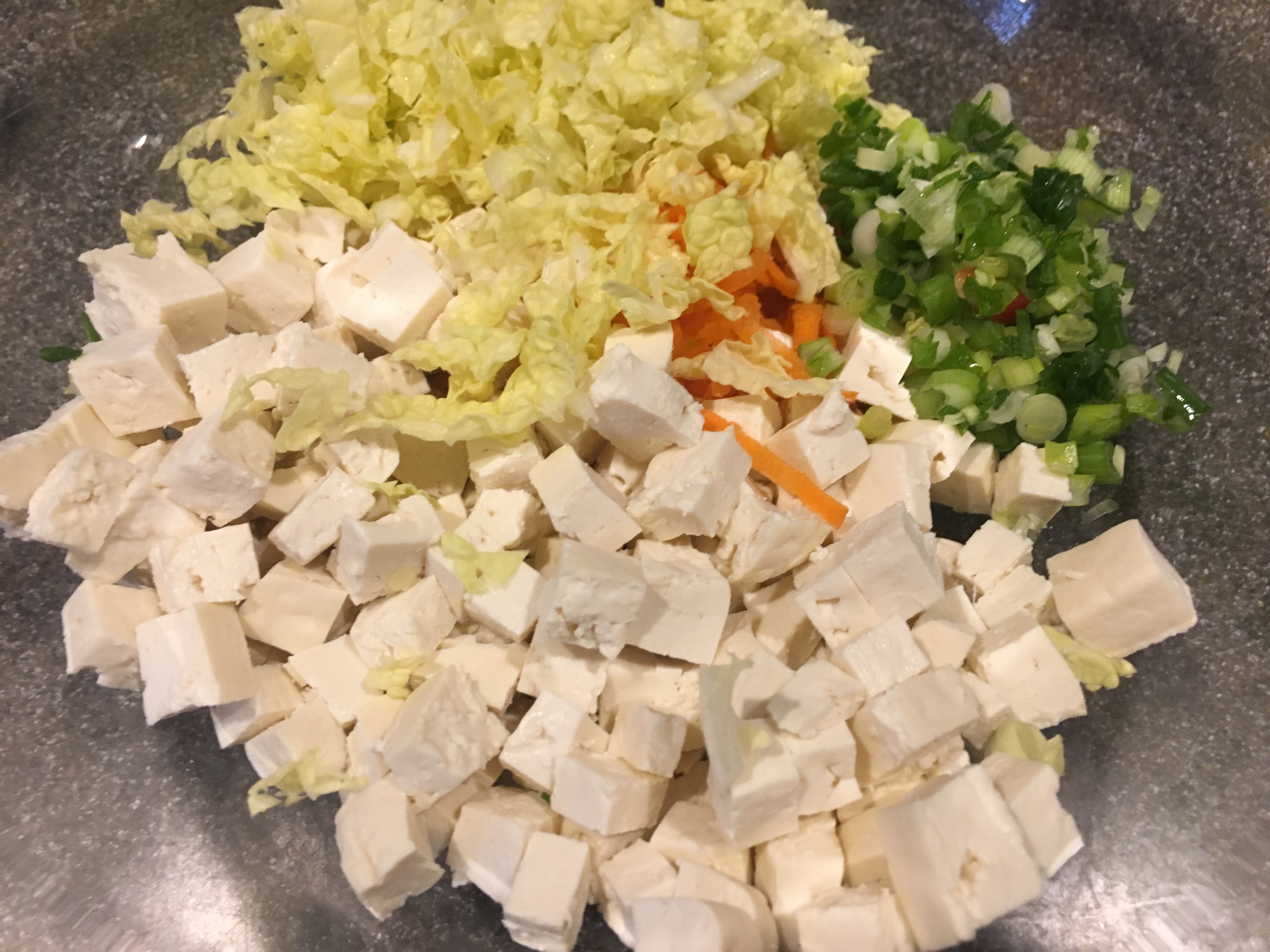 Cubed tofu, grated carrot, Napa cabbage, and scallions.