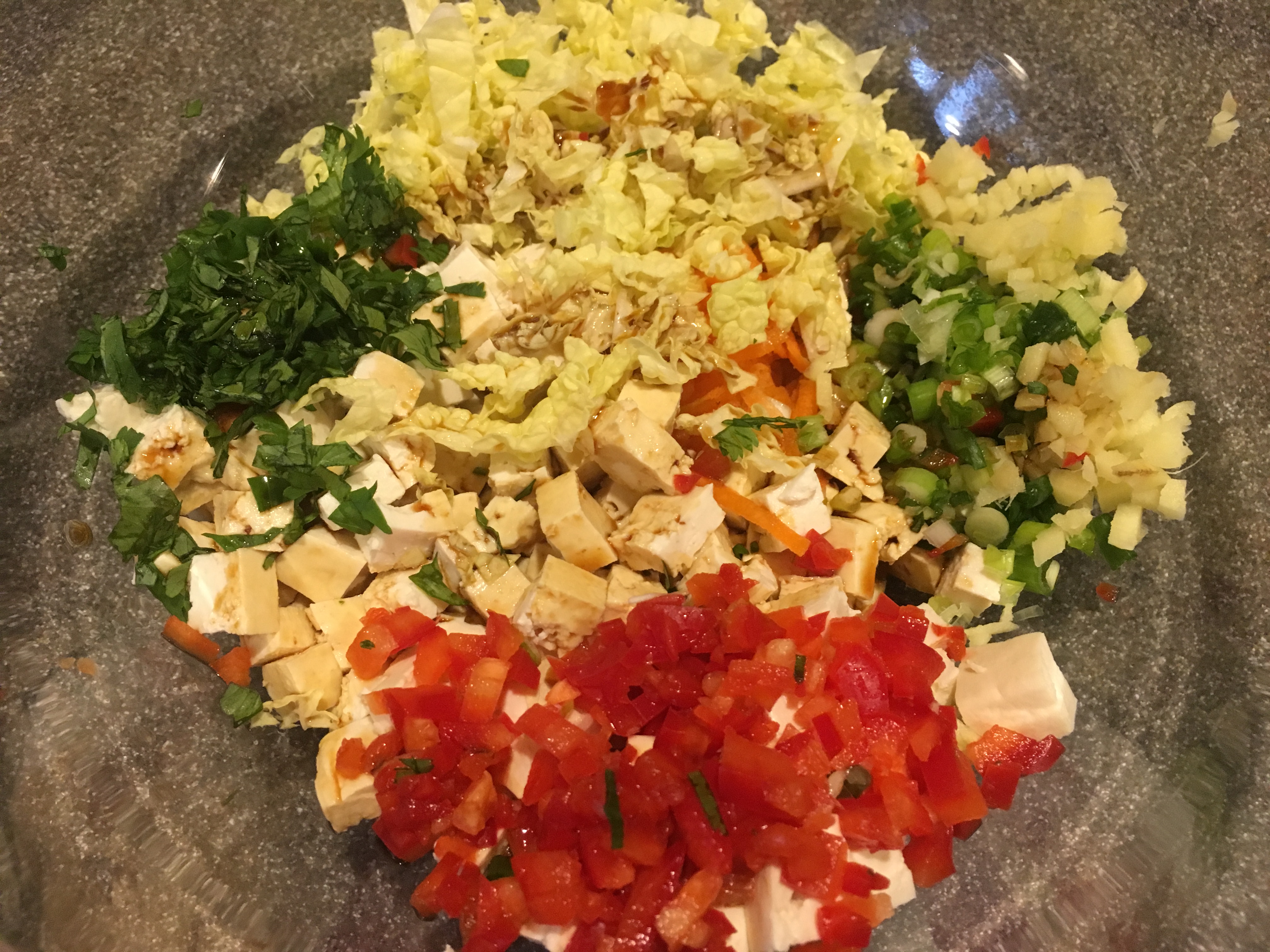 Cubed tofu, grated carrot, Napa cabbage, scallions, red bell pepper, ginger, cilantro, and soy sauce.
