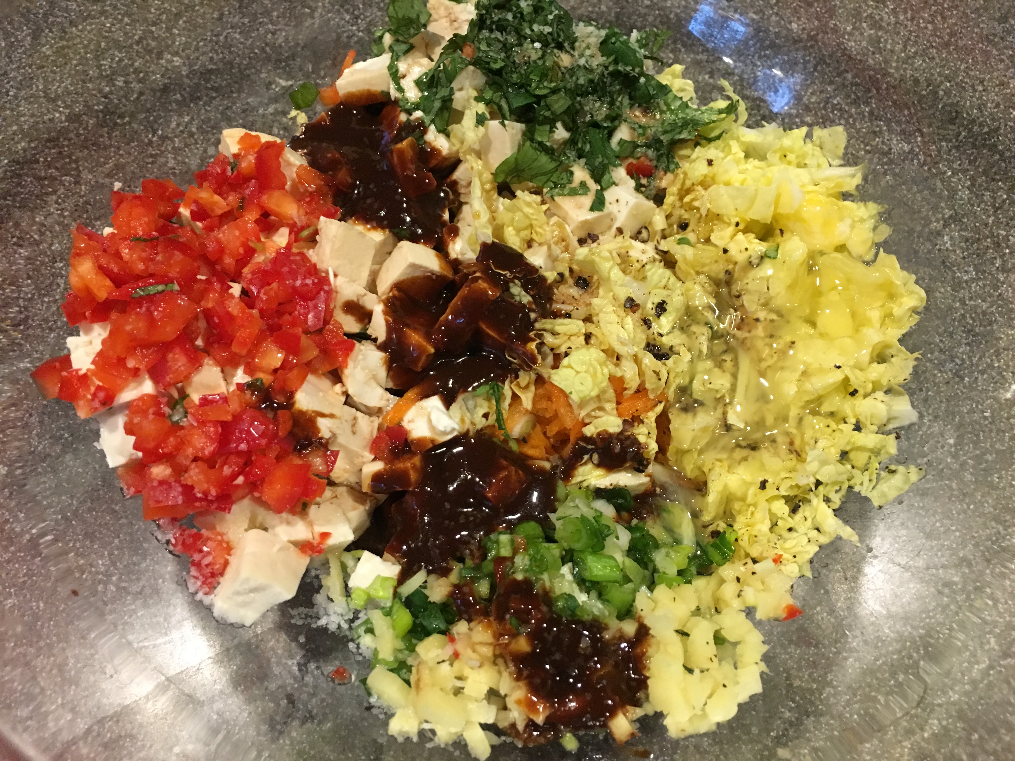 Cubed tofu, grated carrot, Napa cabbage, scallions, red bell pepper, ginger, cilantro, soy sauce, hoisin sauce, sesame oil, Kosher salt, pepper, and a beaten egg.