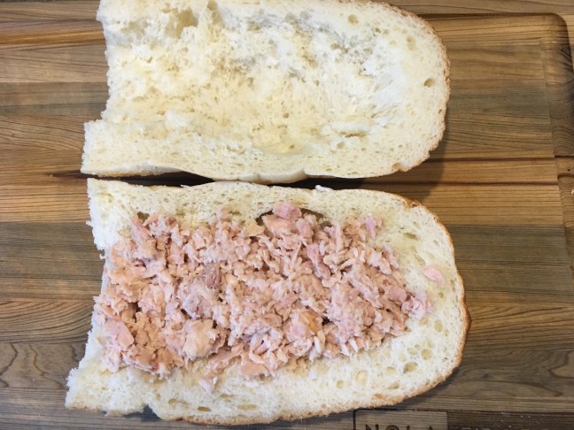 Bottom bread trench filled with tuna fish.