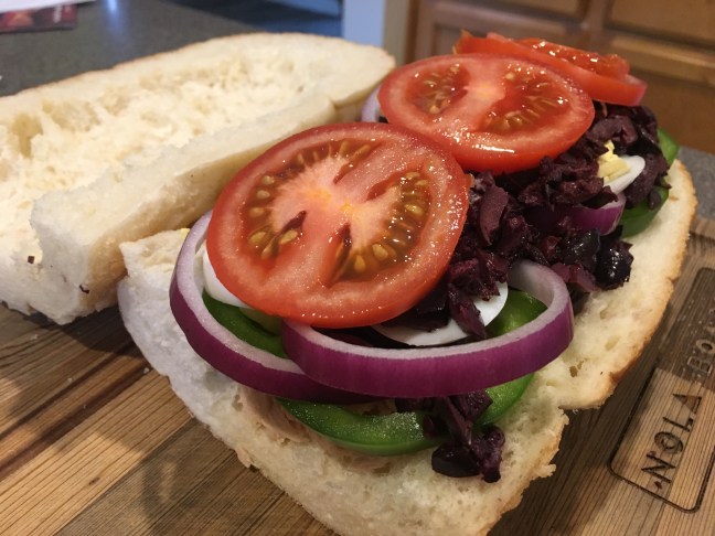 Tuna topped with green bell pepper, red onions, hard boiled egg, Kalamata olives, and tomato.