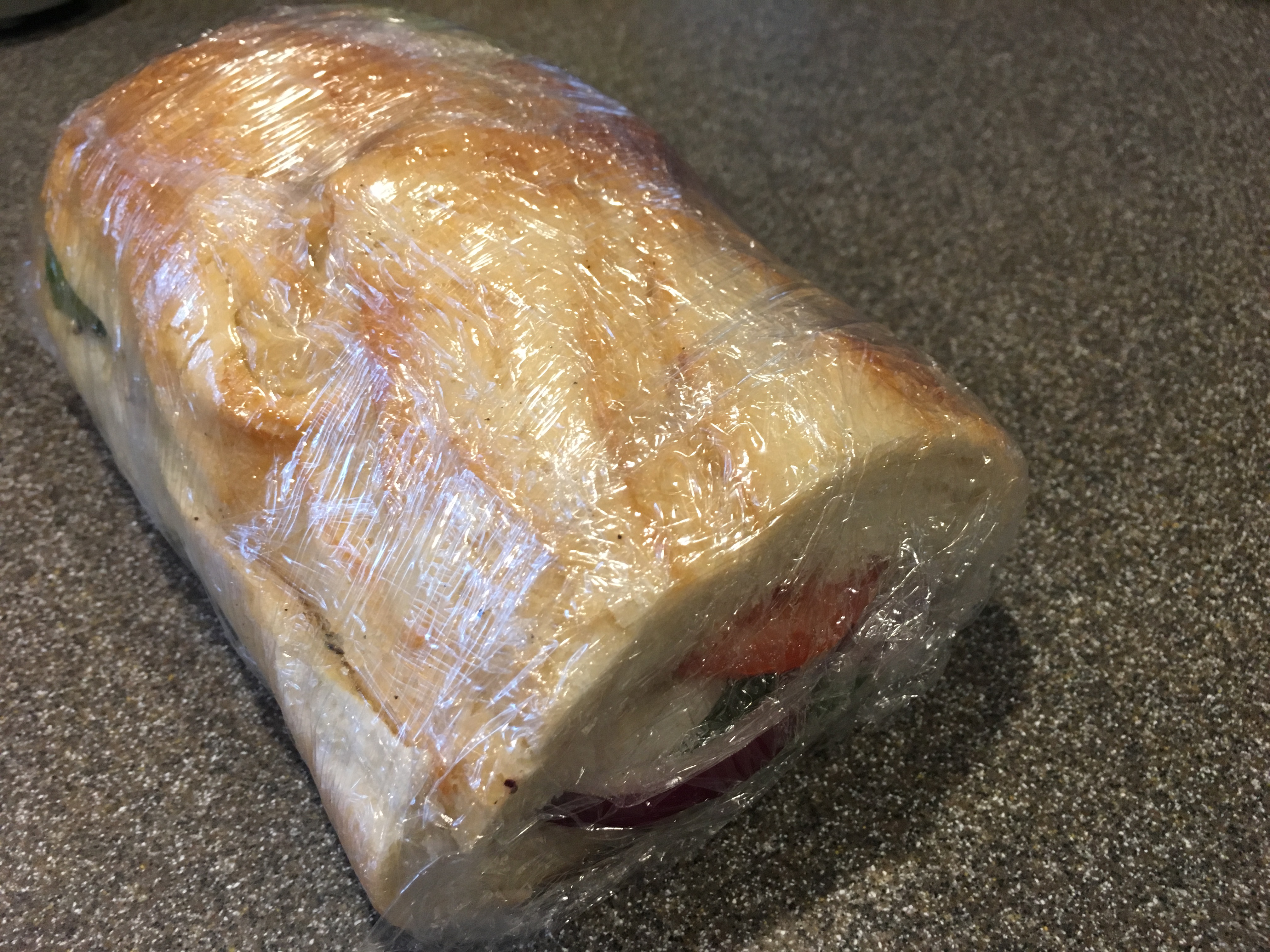 Top layer of bread put on and sandwich wrapped tightly in plastic for two hours.