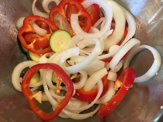 Zucchini, red bell pepper, onion, and garlic tossed with olive oil.