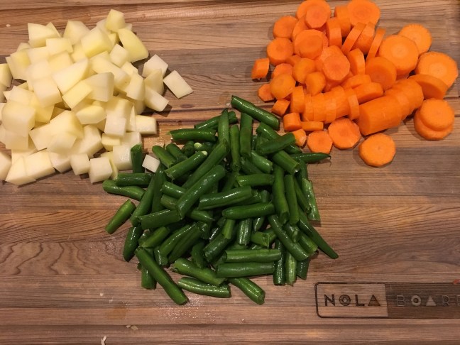 2 C each of peeled potato, peeled carrot, and green beans.