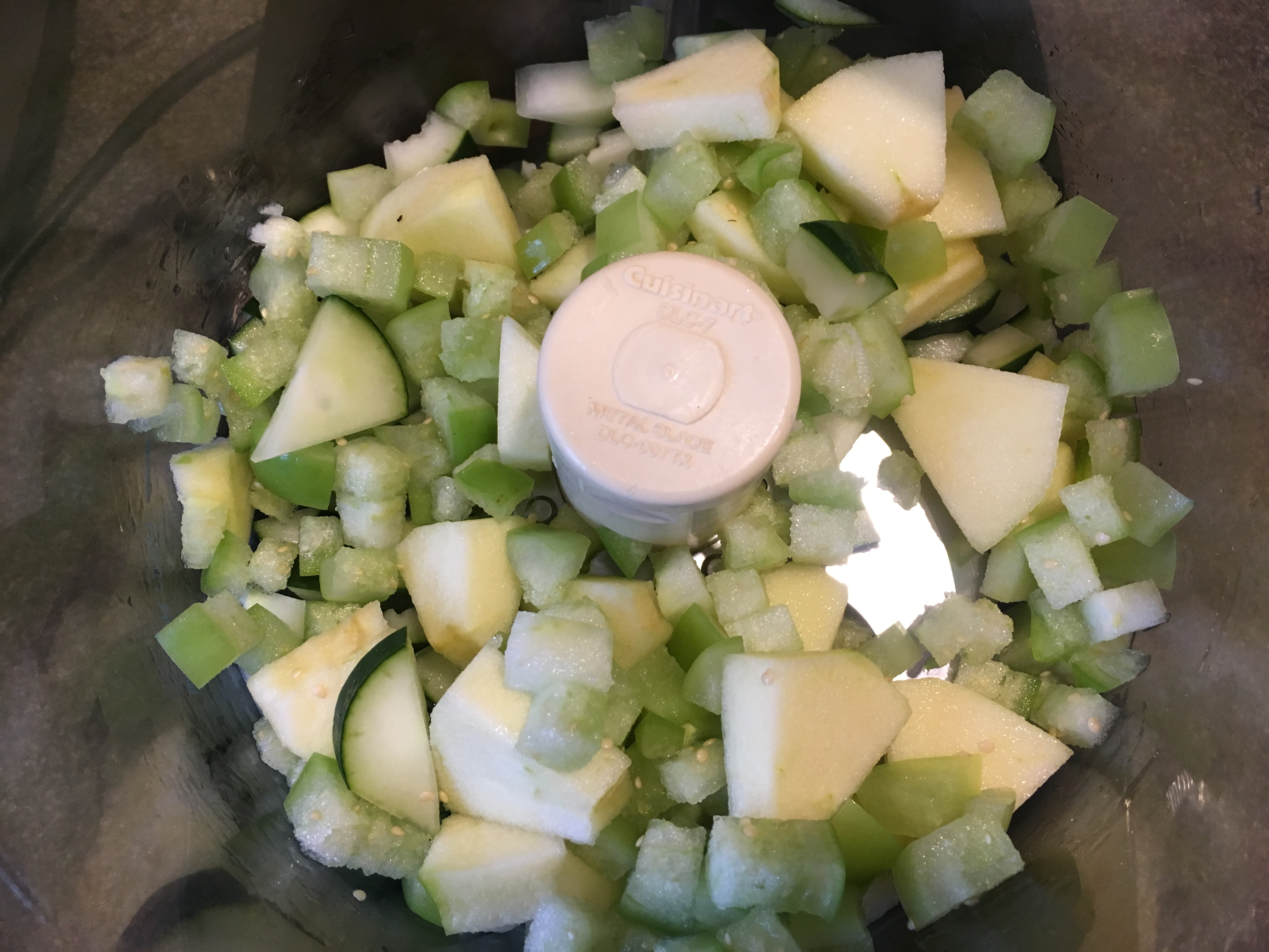 Half of the cucumber, apple, and tomatillos in a food processor.