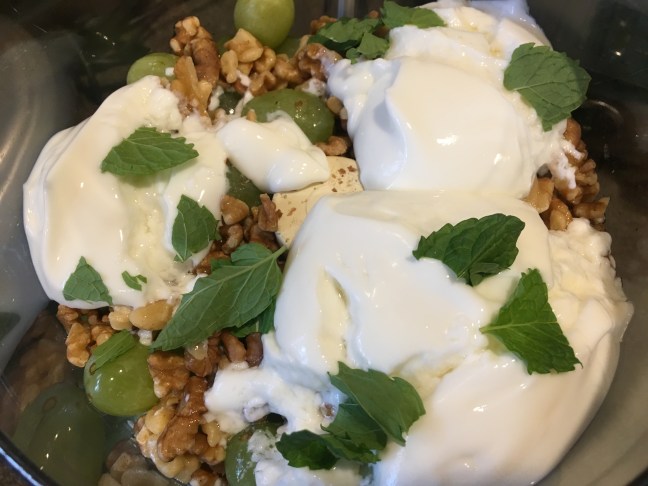 White grape juice, rice wine vinegar, and mint added to the food processor.