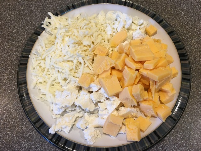 A pound of cheese: cheddar, goat, mozzarella, and queso fresco.
