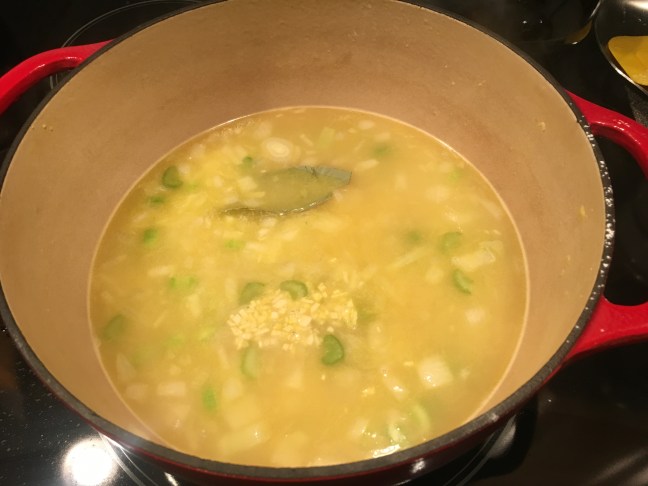 Bay leaf and garlic added to soup.
