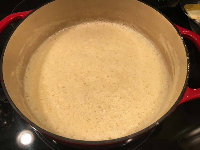Soup after blending with immersion blender.
