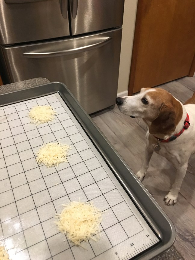Tablespoonfuls of grated Parmesan placed on lined baking sheet and flattened into discs.