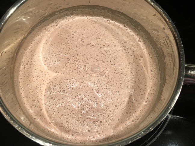 Cocoa powder combined with milk and cream, and brought to a simmer.