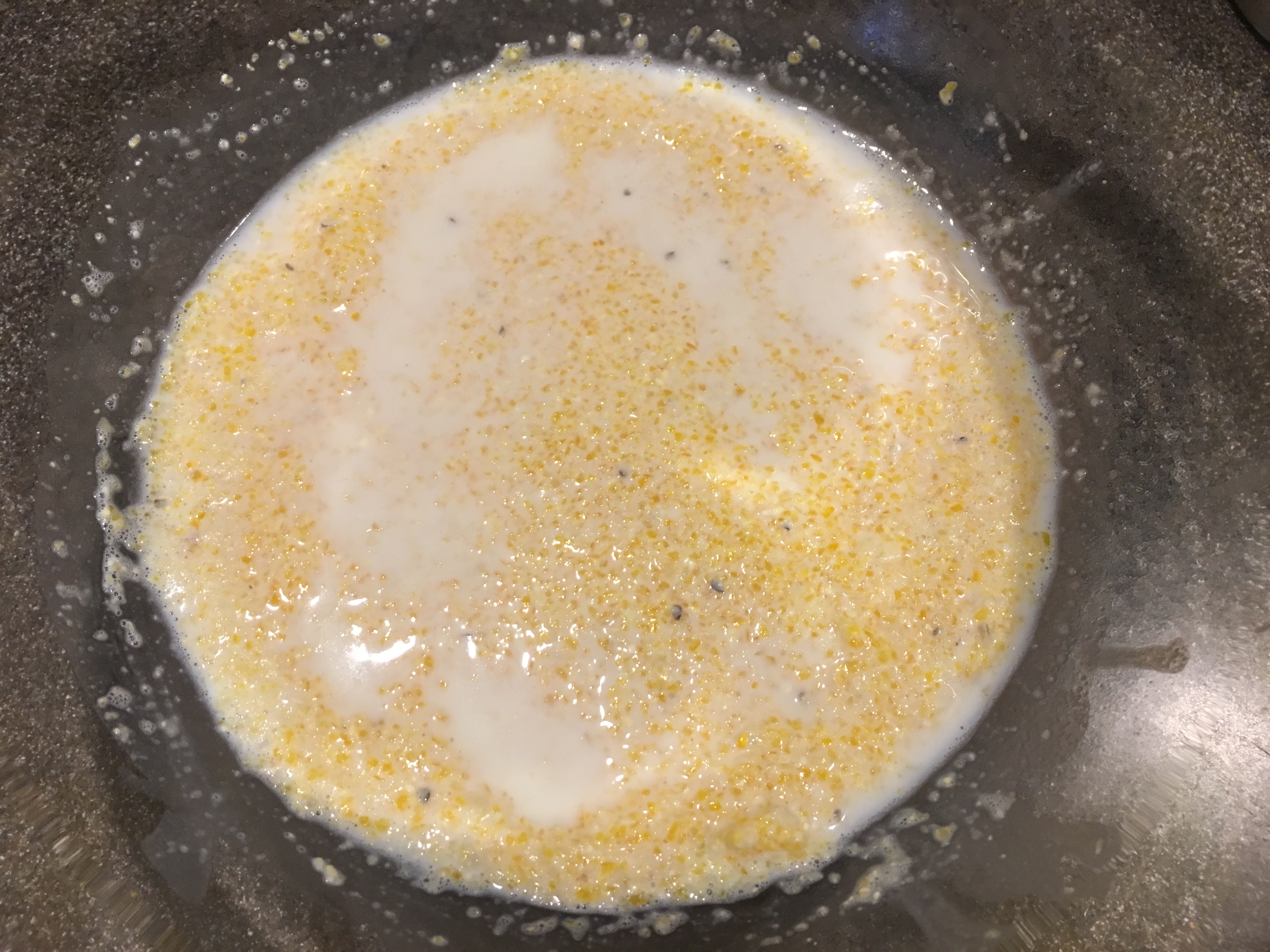 Coarse cornmeal added to boiling milk.